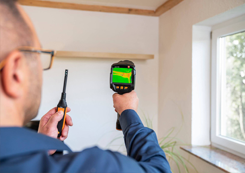 使用德圖熱像儀特有的表面濕度成像功能,在熱像儀顯示屏上以“交通信號燈”的方式顯示熱薄弱點(diǎn)的發(fā)霉風(fēng)險(xiǎn)。 在熱圖中直接呈現(xiàn)霉變隱患區(qū)域、可以連接溫濕度儀