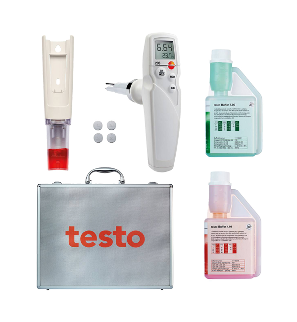 testo 205pH酸堿度/溫度測量入門級套裝,包含凝膠保護帽,250mL標定液,pH4和pH7標定液,支架和鋁制儀器箱。