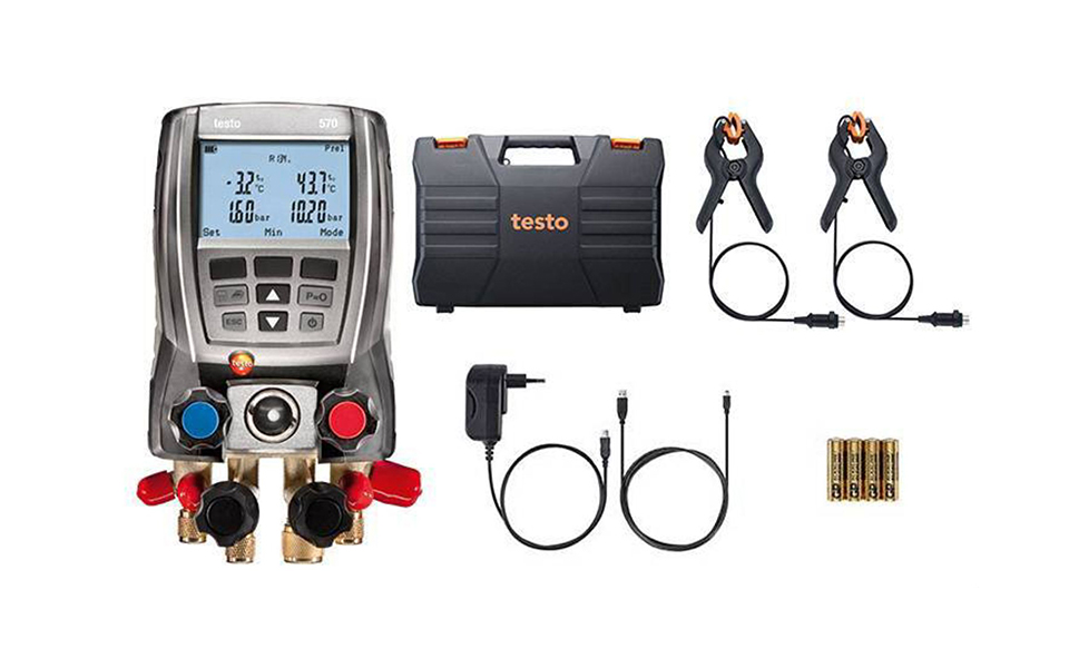 testo 570 專業(yè)級電子冷媒表組套裝、包括主機,4通閥組,內(nèi)部數(shù)據(jù)存儲器、集成真空測量探頭,3個溫度探頭連接,2個鉗形探頭、testo EasyKool 專業(yè)電腦操作軟件(用戶可下載)、USB數(shù)據(jù)線,儀器箱、電源適配器,電池以及出廠報告。