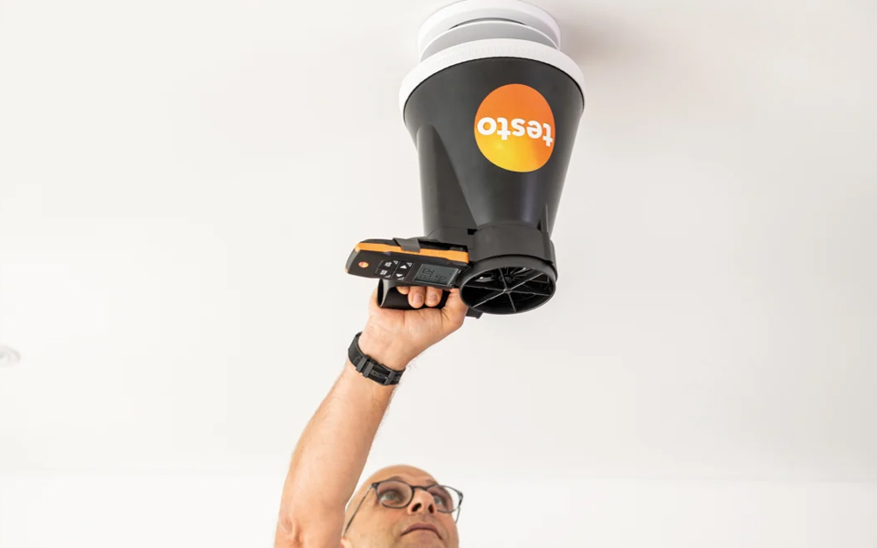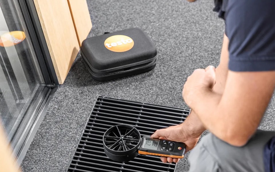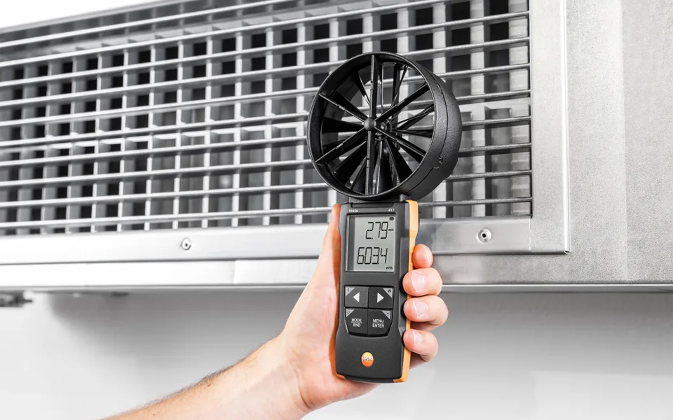 使用 testo 417葉輪風(fēng)速計(jì),快速、精確測(cè)量空調(diào)和通風(fēng)系統(tǒng)進(jìn)風(fēng)口和排風(fēng)口的風(fēng)速風(fēng)量、溫度??蛇x配風(fēng)量罩和輔助風(fēng)管,有助于檢測(cè)格柵出風(fēng)口和風(fēng)閥處的風(fēng)量。時(shí)間段和多點(diǎn)平均值以及風(fēng)量自動(dòng)計(jì)算并顯示在屏幕上。